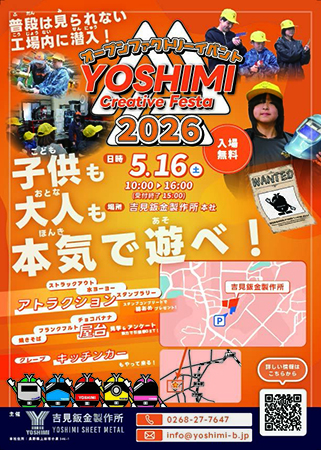 長野県上田市に本社を構える吉見鈑金製作所は、5月16日(土)、本社工場にて体験型オープンファクトリーイベント「Yoshimi Creative Festa 2026」を開催する。
