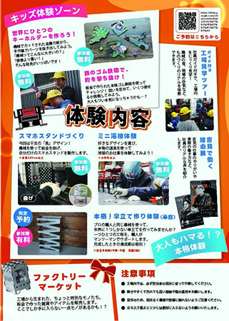また、本格体験には、身長140cm以上対象の「スマホスタンドづくり」をはじめ、「ミニ溶接体験」「本格!傘立て作り体験」を行う。