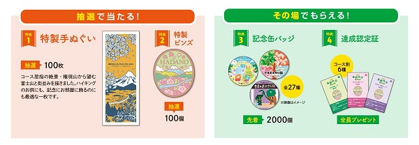 「秦野丹沢ハイキングスタンプラリー」では、各コースを達成すると、記念缶バッジと達成認定証がもらえる。さらに「特製手ぬぐい」と、山のお土産ブランド「Yamasanka(ヤマサンカ)」とコラボした特製ピンズがもらえる抽選に応募できる。