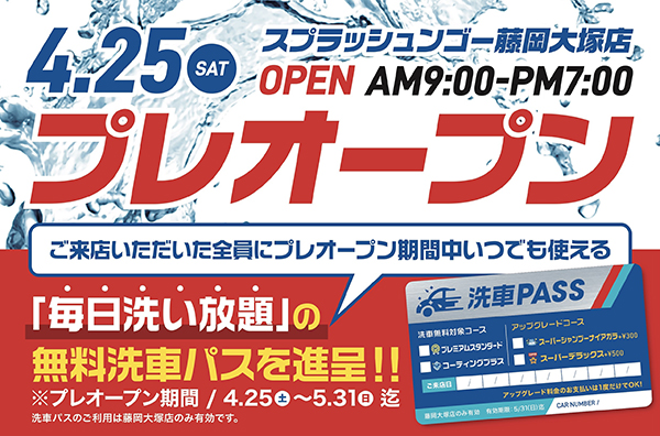 4月25日(土)~5月31日(日)までのプレオープン期間中には、来店した人全員に、期間中いつでも使える「毎日洗い放題」の無料洗車パスをその場で配布する。手続きは一切不要で、2回目以降はパスを提示するだけで5月末まで何度でも無料で利用できる。