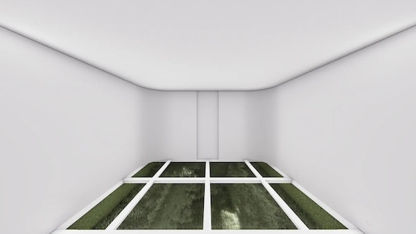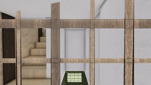 そこから階段を下り、1階の室Bへと進むと、床一面に広がるガラス越しに、半地下に設えられた庭が現れる。1階の室Bは、その半地下空間を“奥庭”として見立てて構成されており、床下に広がる庭と連続することで、視線はさらに奥へと導かれる。視覚的な広がりとともに、空間は次第に内側へと閉じ、見るという行為から、感じるという体験へと移行していく。