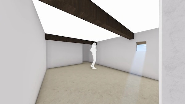 来訪者は、通りから一歩奥へと進み、玄関(前庭)から建物内部へと導かれたのち、2階へと上がる。上層となる2階の室Aは、白い壁と天井によって構成された抽象的な空間で、均質な光が展示物の輪郭を静かに浮かび上がらせる。