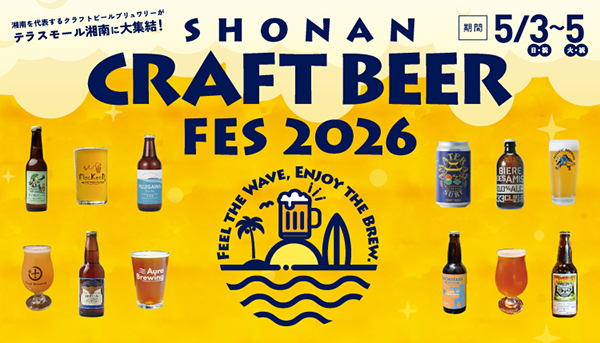 住商アーバン開発が運営するショッピングセンター、テラスモール湘南にて、5月3日(日・祝)~5日(火・祝)の3日間、「SHONAN CRAFT BEER FES 2026」が開催される。湘南エリアを代表するブリュワリー12店舗が一堂に会するほか、親子で参加できるワークショップの実施など、家族で楽しめるビールフェスだ。