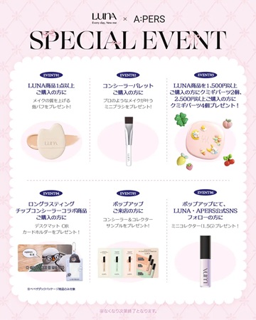 メイクアップブランド「LUNA(ルナ)」は、4月22日(水)~5月13日(水)の期間、体験型ライフスタイルセレクトショップ「A:PERS(エイパース)」で、POP-UPイベント「LUNA × A:PERS SPECIAL POP-UP」を開催する。