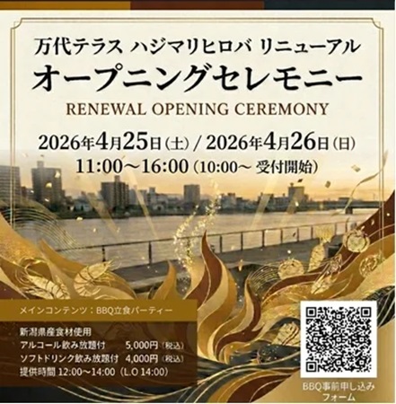 ピーエイインカネイト新潟は、万代エリアの「万代テラス ハジマリヒロバ」をリニューアル。4月25日(土)~26日(日)の2日間でオープニングイベントを開催する。メインコンテンツとして、BBQ立食パーティーが催される。