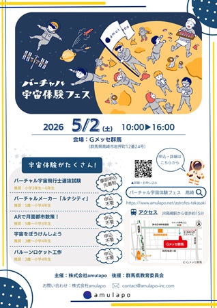 amulapo(アミュラポ)は、群馬県高崎市にある「Gメッセ群馬」にて、「バーチャル宇宙体験フェス in 高崎」を5月2日(土)に開催する。