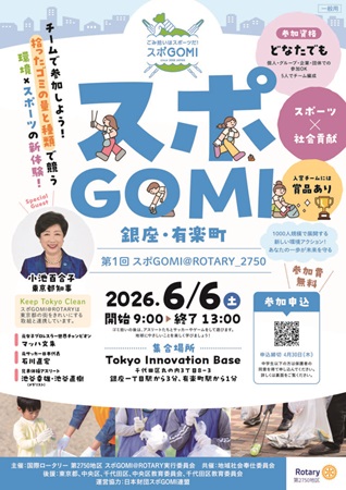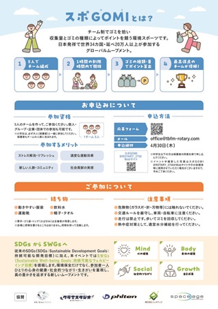 国際ロータリー 第2750地区 スポGOMI@ROTARY実行委員会は、6月6日(土)に、「第1回 スポGOMI@ROTARY_2750(以下、スポGOMI)」を開催する。参加費は無料。5月20日(水)まで、3~5名のチーム単位での参加申込を専用フォームにて先着順で受け付けている。※ただし定員になり次第締め切りとなる。