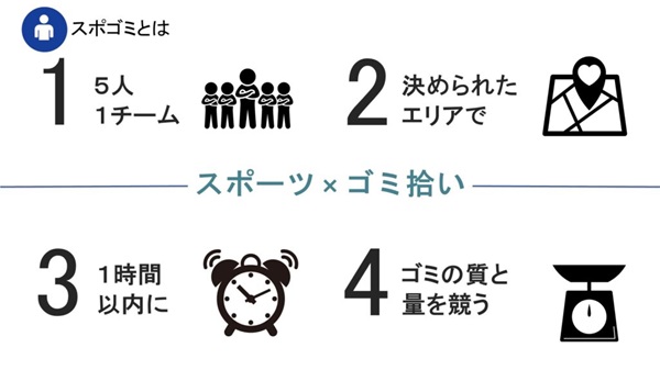 「スポGOMI」は、決められたエリアで1時間の制限時間内にチームでゴミを拾い、収集量とゴミの種類によってポイントを競う環境スポーツ。入賞チームには賞品を用意している。