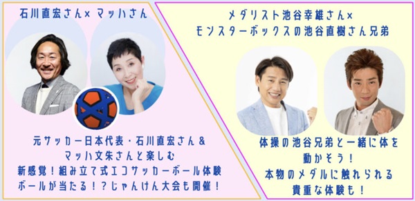 マッハ文朱さんと石川直宏さんとは、組み立て式エコサッカーボール体験ができる。じゃんけん大会では、ボールが当たるかもしれない。池谷さん兄弟とは、一緒に体を動かそう。本物のメダルに触れられる貴重な体験も。