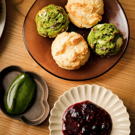 スイーツやセイボリーにも一保堂茶舖の抹茶を使用。甘酒と合わせたヴェリーヌ、柑橘と合わせたタルトレット、サーモントラウト マリネと抹茶の包み、抹茶とホワイトチョコのスコーンなど、さまざまな味わいで抹茶の新たな美味しさを発見できる。