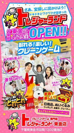 アミューズメント施設を展開する山崎屋は、4月25日(土)、千葉県東金市にクレーンゲーム特化型ブランドの4店舗目、かつ関東一号店となる「トレジャーランド東金店」をグランドオープンした。