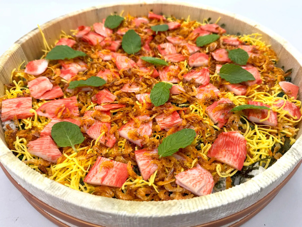 カニ蒲鉾や錦糸卵、キクラゲなど多種の具材を、出汁の効いた酢飯と一緒に味わえる。