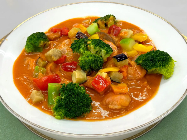 「若鶏のトマトクリーム煮」は、柔らかな鶏肉を、茄子やマッシュルーム、ブロッコリーなどの豊富な野菜と共に、濃厚なトマトクリームでじっくりと煮込んでいる。