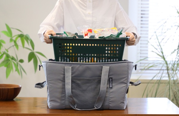 そんな悩みを解決してくれるのが「マイバスケットクーラー」。一般的な買い物かごサイズ(28~33L)にフィットする大きさで、レジカゴをそのままとすっぽり収納できるため、面倒な袋詰め作業を省ける。底面を支える中敷きや、保冷力を維持するウレタンがしっかりと中身を保護。もちろん、買い物かごなしでも安定して使える。