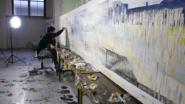 作品は、大型キャンバスに撮影と加筆を繰り返し、その変化の過程を1秒12フレームで記録して映像化する「ストップモーション絵画」によって、動作の痕跡や時間の層、人間の存在を浮かび上がらせる。