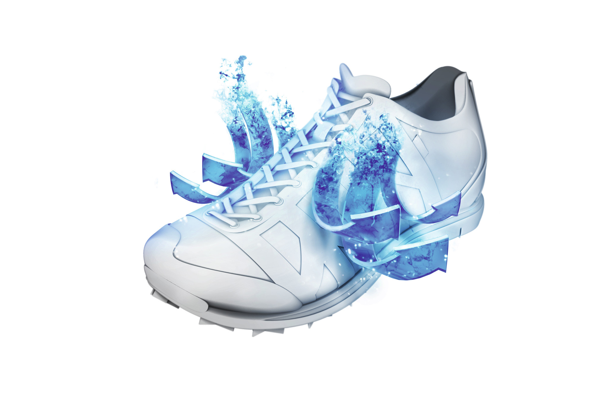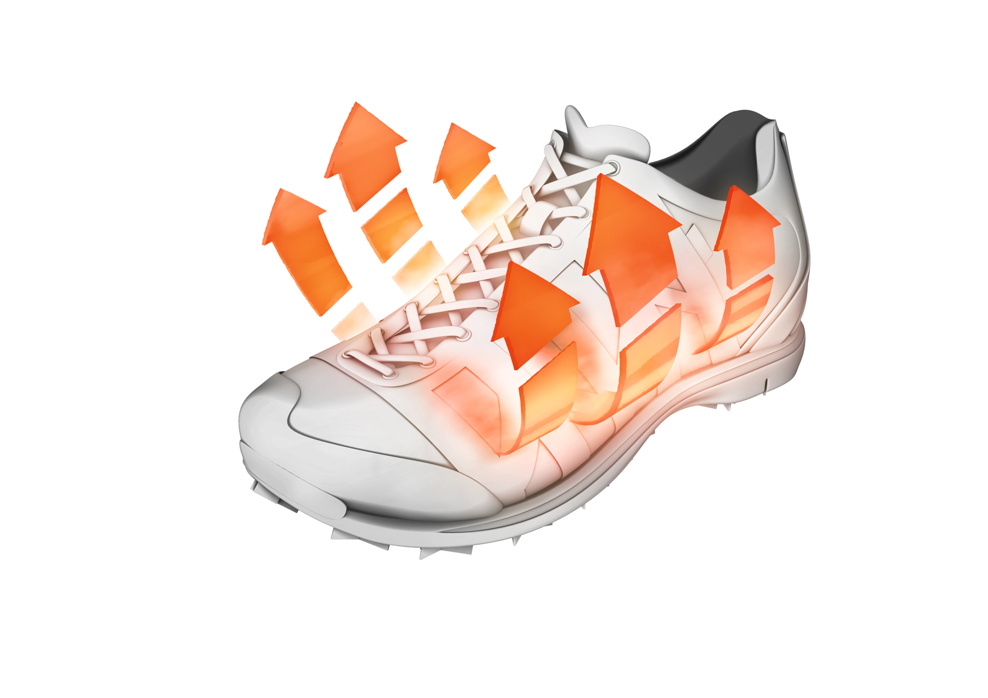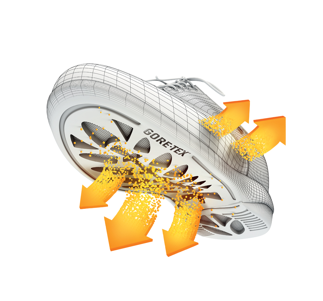 強度やグリップ性などを必要としているアウトドア用途のシューズには足底部とソールの間に湿った空気が抜けるよう設計し、靴の横に設けられたメッシュの開口部から排出されます。