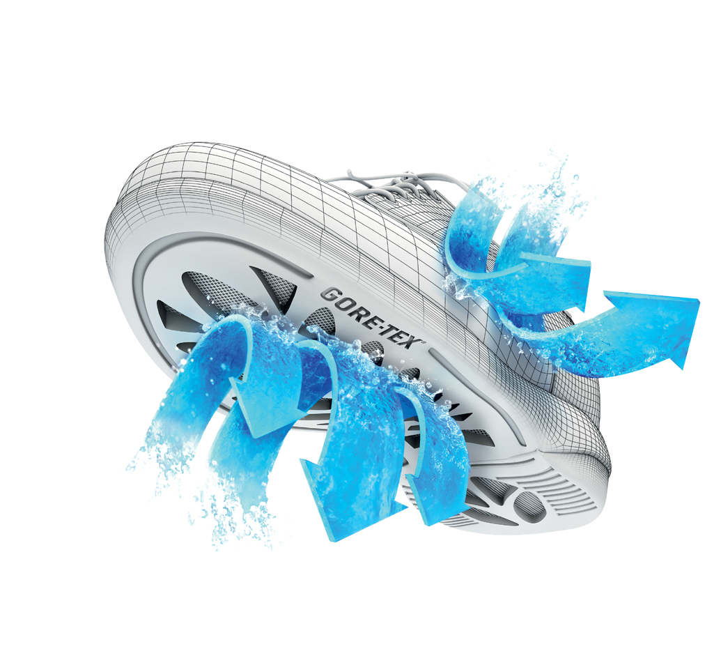 「GORE-TEX(R) SURROUND™プロダクトテクノロジー」は雨だけでなく、晴れの日でも快適な足元で過ごせるよう開発されています。従来の防水性はそのままで、足の底部からも靴内の湿った空気が抜ける構造になっています。雨で濡れないのはもちろん、靴全体から360°透湿することが最大の特徴で、より早く足をドライで快適に導く新しいタイプのフットウェアの機能です。この360°透湿する機能は2つの異なる構造に秘められています。