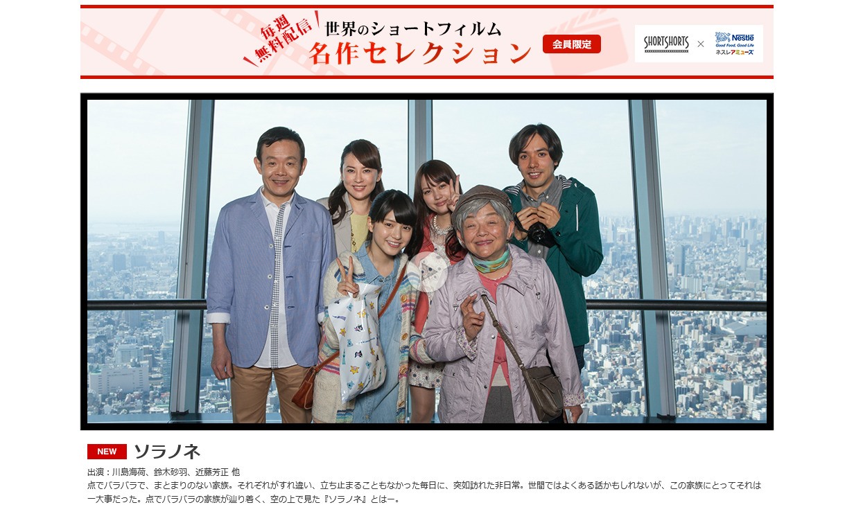 「世界のショートフィルム★名作セレクション」は、アジア最大級の国際短編映画祭ショートショート フィルムフェスティバル & アジアの企画・運営を手がける株式会社パシフィックボイス(本社:東京都渋谷区、代表取締役社長:別所哲也)の協力のもと、世界各国の名作ショートフィルムを厳選。ひとつのテーマをもとに2作品がセレクトされており、そこに描かれた国や地域で異なる様々な文化・家族とのつながり・恋愛観などを通して“人生の素晴らしさ”を感じていただけます。川島海荷さん主演の話題作『ソラノネ』(中茎 強〈なかくき つよし〉監督)を皮切りに、毎週1作品ずつ公開していきます。