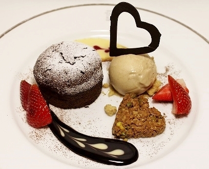 同じくバレンタイン期間のみ、カフェスペースのある表参道ヒルズ店では、ハートづくしの限定ショコラデザートを提供いたします。とろけるあつあつフォンダンショコラに、自家製のなめらかなナッツのアイスクリーム、濃厚チョコレートソースの組み合わせです。添えられたピスタチオ風味のフレークとチョコレートまでハートづくしの一皿です。