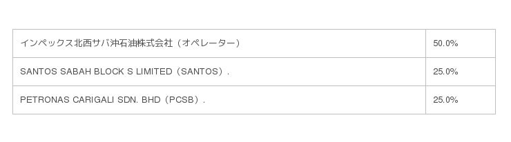 2012年1月、INPEXは、マレーシア国営石油会社ペトロナスと生産分与契約を締結し、オペレーターとしてマレーシア・サバ州沖深海S鉱区に参入し、INPEX100%子会社の会社を設立しました。現在、会社は本鉱区の権益比率50%を保有しています。