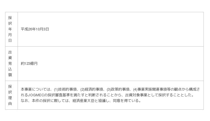 JOGMECは、会社が負担する探鉱事業費の50%を上限に同社に対して出資を行います。