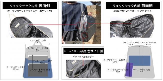 背負うことで隠れる安全性の高い背面ポケットは航空券を折り曲げることなく収納できる特大サイズ。前面サブポケット内部には内ポケットとキーリング、メイン収納部にもノートパソコン(Macbook Pro13インチ収納可)が収納できるポケット含め、大小多数のポケットを取り付けて収納の悩みを幅広くカバー。