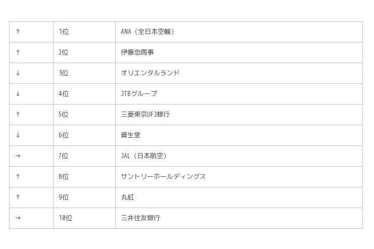 ANA(全日本空輸)が総合1位に輝く。自動車、食品、機械、総合商社、都銀等はランクアップ、サービス、放送等はランクダウンと業界により明暗が顕著に。