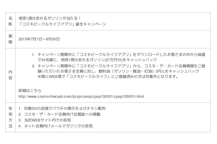 コスモ石油株式会社(代表取締役社長:森川桂造)では、コスモ・ザ・カード会員向けのインターネットサービス「コスモビークルライフ」専用のスマートフォン用アプリである「コスモビークルライフアプリ」のリリースを記念して、以下のキャンペーンを実施しますのでお知らせいたします。