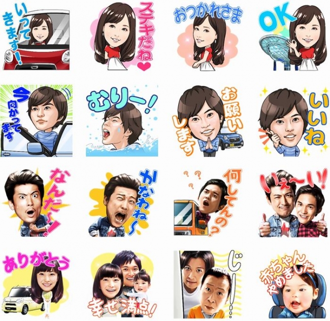 このたび配信する全16種類のLINEスタンプでは、「新型キャスト」「ウェイク」「タント」のCM契約タレントとともに、CMのシーンをイラスト化しました。