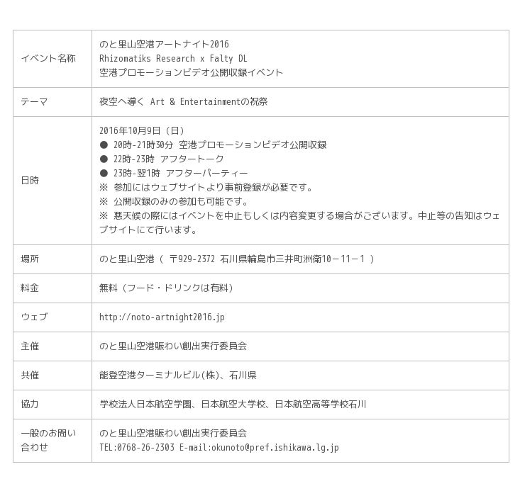 のと里山空港賑わい創出実行委員会(代表:石川県奥能登総合事務所長 前田正彦)は「のと里山空港アートナイト2016 Rhizomatiks Research x FaltyDL」にて、10月9日(日)に公開収録する空港プロモーションビデオ(PV)の使用楽曲を決定いたしました。公開収録の参加申し込みは、9月9日(金)から9月28日(水)まで特設ウェブサイト(http://noto-artnight2016.jp)にて受け付けます。(※定員に達し次第、受付は終了致します)