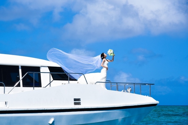 フラワーシャワー後は、大切なゲストからの祝福と、広大に広がる南国のガーデンと海に抱かれた景色の中での写真撮影が待っています。「アートグレイス オーシャンフロントガーデンチャペル沖縄」でしか撮れない、雄大な海と空をバックにしたウェディングフォトを存分にご堪能ください。さらに、沖縄のチャペルでは初の試みとして、チャペルから徒歩30秒のプライベートマリーナから、ホテル専用の大型クルーザーで海に出て船上集合写真が撮影できるプランもご用意。挙式後にすぐ海に出ることも可能です。クルーズでのウェディングフォトはリーズナブルな8万円(税別)からご用意しました。※記念写真の撮影・クルーズはオプションです