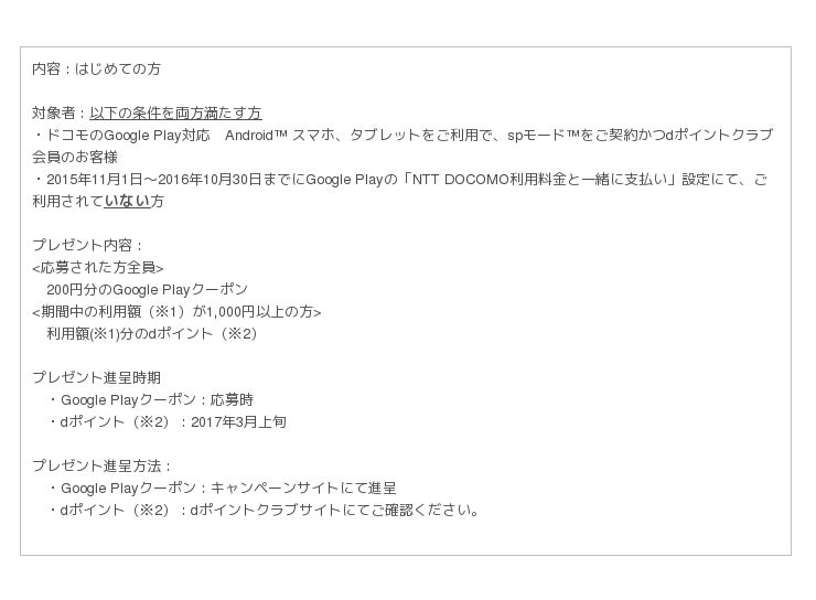 プレゼント有効期限(※3):Google Playクーポン、dポイント(※2)共通 2017年3月31日(金)