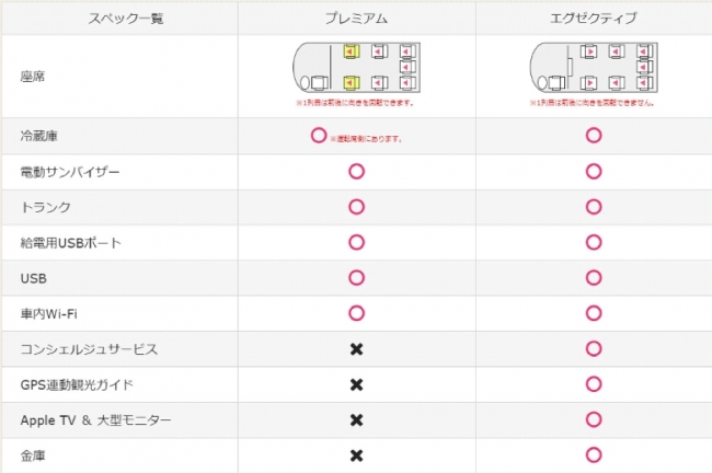 車輌タイプは、プレミアムとエグゼクティブの2種類あります。