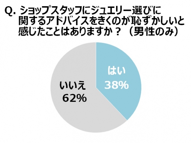 <ジュエリー迷子>にならないようジュエリーショップでスタッフのアドバイスをきくことも対策の一つと言えますが、そもそも「ジュエリーショップに入りづらい」と思う男性は55%。さらに「ショップスタッフにジュエリー選びに関するアドバイスをきくのが恥ずかしい」という人も約4割(38%)おり、男性が<ジュエリー迷子>に陥る一因として、ジュエリーショップへの入店やお店での立ち居振る舞いに自信がないことも挙げられると言えるでしょう。