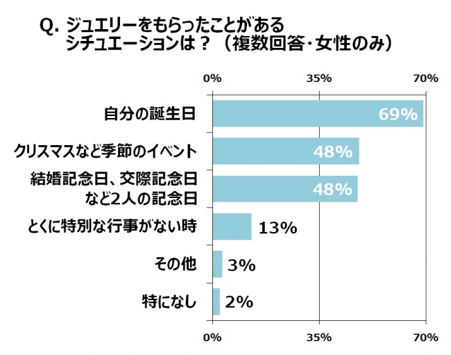 また、ジュエリーをもらったら嬉しいと思うシチュエーションとしては「2人の記念日」(38%)、「季節のイベント」(34%)、「とくに特別な行事がない時」(32%)が続きました。