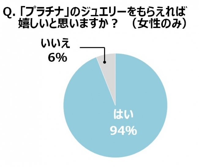 一生身に着けられ、ジュエリー素材の代表格である「プラチナ」に対しては、女性89%が「耐久性が高いイメージがある」、さらに、94%が「もらえれば嬉しいと思う」と回答しており、女性の胸キュンポイントを突くジュエリー素材であることが分かります。