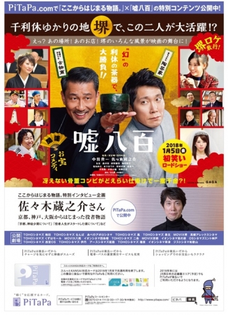 スルッとKANSAIでは、PiTaPaへのイメージ醸成・魅力を発信し、新規入会につなげるコンテンツを公開する『ここからはじまる物語。』キャンペーンを展開しています。キャンペーンの一環として、新春映画「嘘八百」(主演:中井貴一、佐々木蔵之介、2018年1月5日公開)とコラボし、主演をつとめる佐々木蔵之介さんのスペシャルインタビュー「京都、神戸、大阪からはじまった役者物語」を公開しています。
