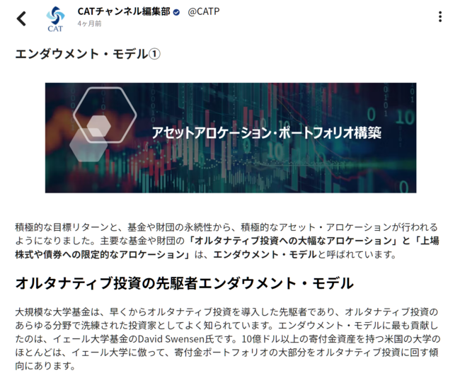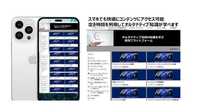 今回は、第1弾のプレローンチで、オルタナティブ投資の教育コンテンツに投資家会員が無料でアクセスできるサービスを開始します。コンテンツは当社のアナリストらのオルタナティブ投資アナリスト試験の勉強用ノートやテキスト、業界の論文、最新の専門書をベースに【CATチャンネル編集部】が制作・監修したものです。プライベート・クレジット、プライベート・エクイティ、ヘッジファンド、インフラ、コモディティ、実物資産、ESG関連、デュー・デリジェンスやマネージャー選定、アセットアロケーション、リスク管理などオルタナティブ投資分野を広くカバーします。会員には、マネージャー会員(運用会社)と投資家会員があります。