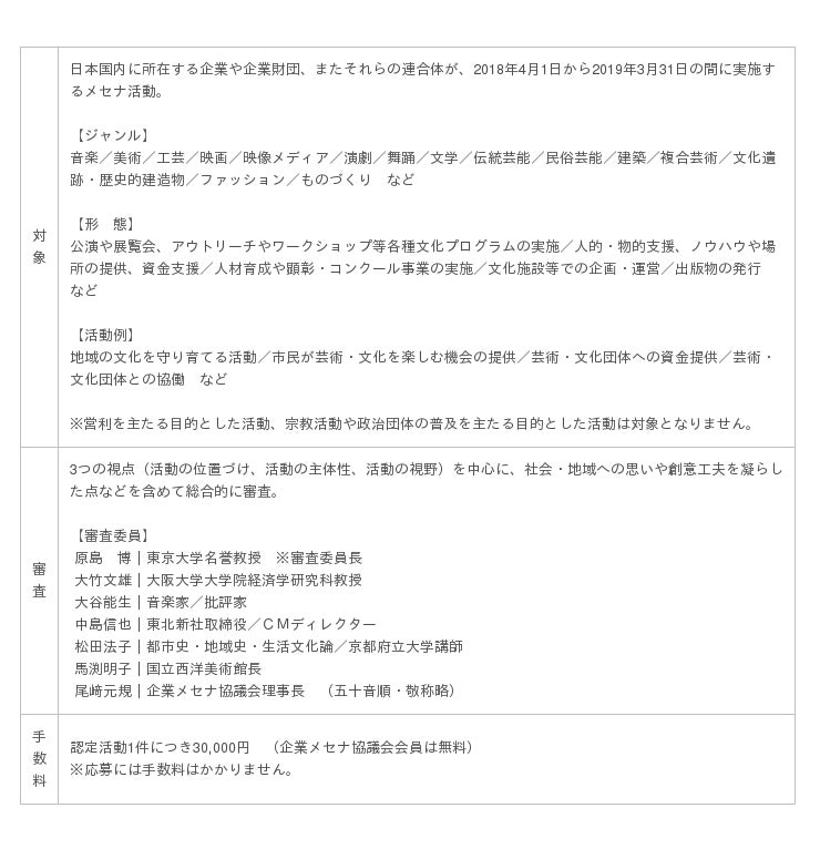 3.認定した翌年には、特に優れた活動を「メセナアワード」(後援:文化庁)にて表彰します。「This is MECENAT 2018」認定活動は、「メセナアワード2019」の選考対象となります。