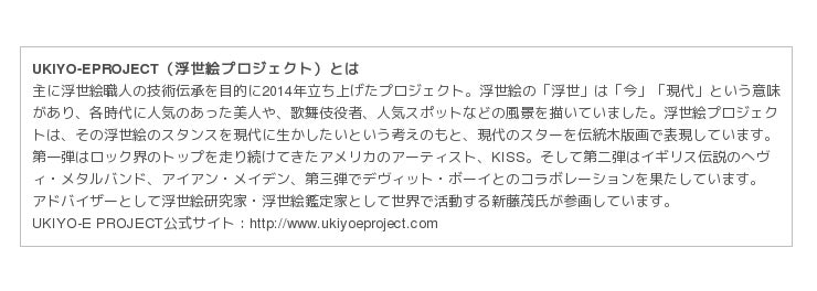 UKIYO-E PROJECTはこの他にも、2019年秋にオーストリア・ウィーンにあるMAK応用美術館にて、同美術館が所蔵する江戸時代の浮世絵コレクションと、UKIYO-E PROJECTがこれまで手がけてきたKISSやアイアン・メイデンとのコラボレーションを含む作品や版木など、今昔の浮世絵をあわせて展示するエキシビションを予定しています。