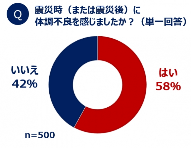 さらに、震災時はケガなどだけではなく「体調不良」を感じた人の割合も58%と約6割に。多くの人が震災の影響で体に不調を感じた経験を持っていることがわかります。具体的な症状としては「不眠」(65%)、「地震酔い」(62%)がツートップとなり、以下、「頭痛」(19%)、「食欲不振」(19%)と続きました。また、車中泊や避難所での生活の影響などで「エコノミー症候群」を発症した人も6%にのぼっています。