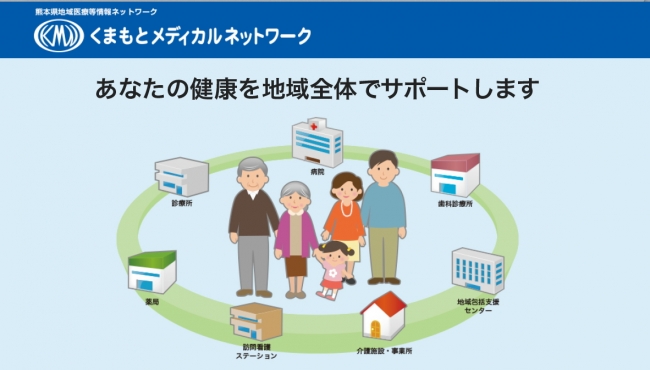 「くまもとメディカルネットワーク」とは、地域包括ケアシステム実現のために病院・診療所・歯科診療所・介護施設・訪問看護ステーション・薬局などの利用施設をネットワークで結び、患者である参加者の診療・調剤・介護に必要な情報を共有することで、医療・介護サービスに活かすシステムです。熊本県医師会のほか、熊本県、熊本大学医学部附属病院から成る「熊本県地域医療等情報ネットワーク連絡協議会」が運営しています。