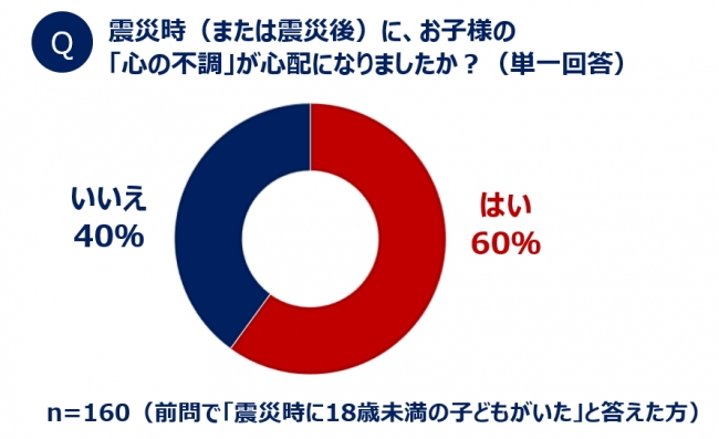 さらに、18歳未満の子どもを持つパパ・ママからは、「子どもが体調不良を訴えた」という声も約4人に1人(26%)にのぼっています。また、体の不調だけでなく「心の不調が心配になった」と答えた人も60%と多く、震災後はさまざまな面で医療・看護のケアが必要になると言えます。