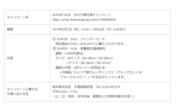 国内売上高NO.1の老舗靴下メーカーの岡本株式会社(本社/大阪市、代表/岡本哲治)は、2月1日の「ニオイの日」にちなみ、ムレない、におわない靴下「SUPER SOX(スーパーソックス)」の特定商品がお得に購入できる『SUPER SOX 冬の汗臭対策キャンペーン』を、2019年2月1日(金)10:00~2月14日(木)9:59の期間限定で実施します。