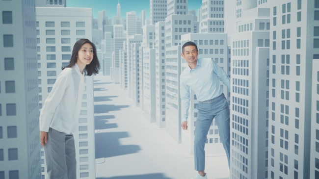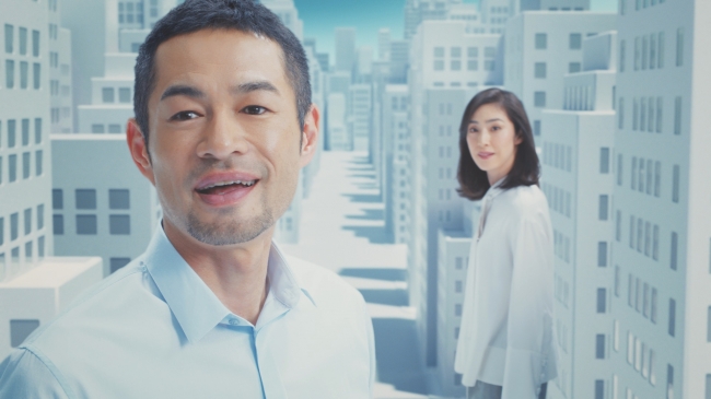 また、CMに登場する白いビル街はすべてCGであるため、その場には無いものを想像しながら演技をしなければならないという難易度の高い撮影でした。それにも関わらずお二人は、まるでビル街が目の前に見えているかのような堂々とした演技を披露。活躍する場は違っても、まさに“プロ”と“プロ”の共演となりました。