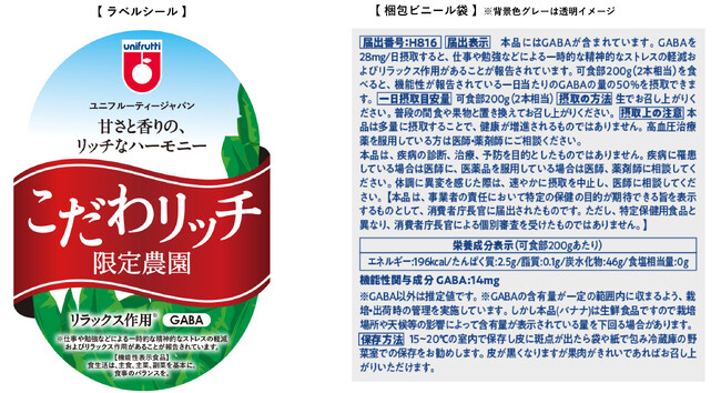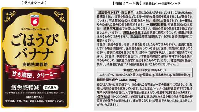 株式会社ユニフルーティージャパン(本社:東京都千代田区 代表取締役社長:ケナード・ウォング)は、ユニフルーティーが生産・販売をしているバナナ2商品において、「リラックス作用(※1)」と「疲労感軽減(※2)」の機能が報告されている機能性関与成分GABA(γ-アミノ酪酸)を含む機能性表示食品として届出が完了しました。これにより「こだわリッチ」にはリラックス作用(※1)、「ごほうびバナナ」には疲労感軽減(※2)の機能性を表示した新パッケージを、5月より順次、流通・販売を開始致します。