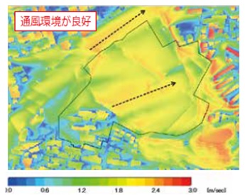 ・現地気象観測データに基づき、街区全体のシミュレーションを行い、「風の道」を活かす街区計画・配棟計画に よってパッシブな街づくり。