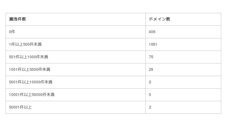 「表1」は件数別にまとめたものになります。漏洩件数が1件以上500件未満、確認されたドメインが最も多く、漏洩が確認されなかったドメインは406ドメインでした。