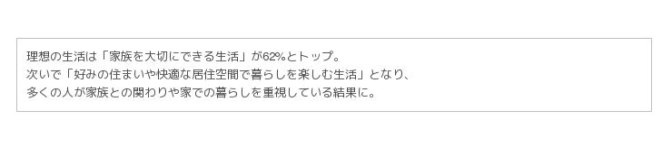 理想の生活の1位は「家族を大切にできる生活」で62%、2位は「好みの住まいや快適な居住空間で暮らしを楽しむ生活」で46%という結果になり、多くの人が、家族との関わりや日々の家での暮らしを重視していることがわかりました。また、3位は「レジャーや娯楽などを積極的に楽しむ生活」 、4位は「趣味に没頭できる生活」となりました。