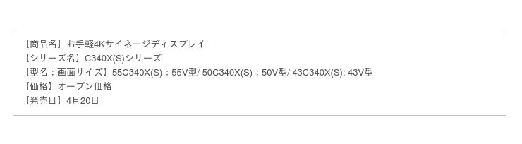 東芝映像ソリューションは、USBメモリーを使用したお手軽4Kサイネージディスプレイ「C340X(S)シリーズ」を4月20日より発売します。